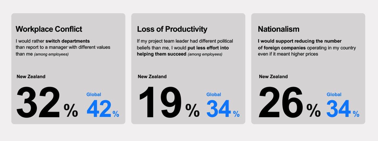 When people are less willing to engage with those who think differently, it becomes harder to collaborate, innovate and make progress. Nearly a third of New Zealand employees (32%) say they would rather switch teams than work for a manager with different values, and some (19%) admit they would put in less effort if they disagreed with their team leader’s views.