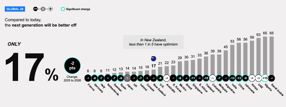 At the heart of this shift is a more uncertain environment. Economic pressure, the rapid pace of technological change, and the ongoing impact of misinformation are all contributing to a loss of confidence about the future. Fewer than one in five New Zealanders (17%) believe the next generation will be better off compared to today, and fears around job security and global instability are rising.